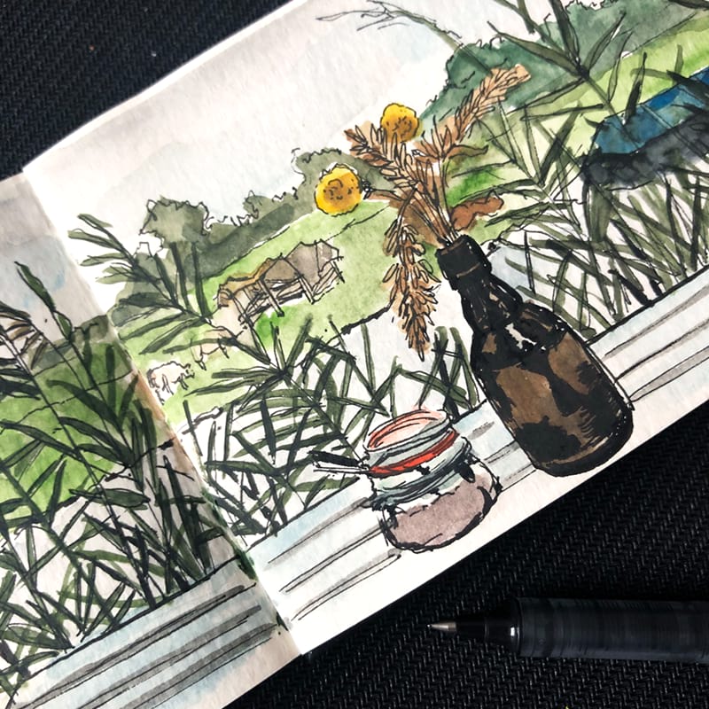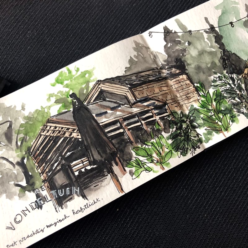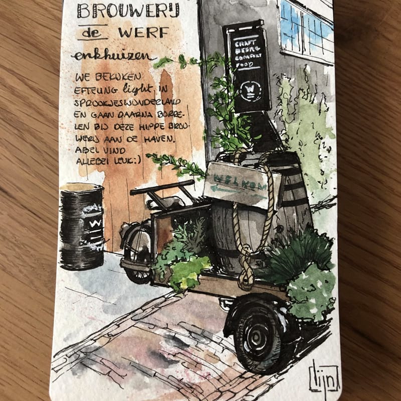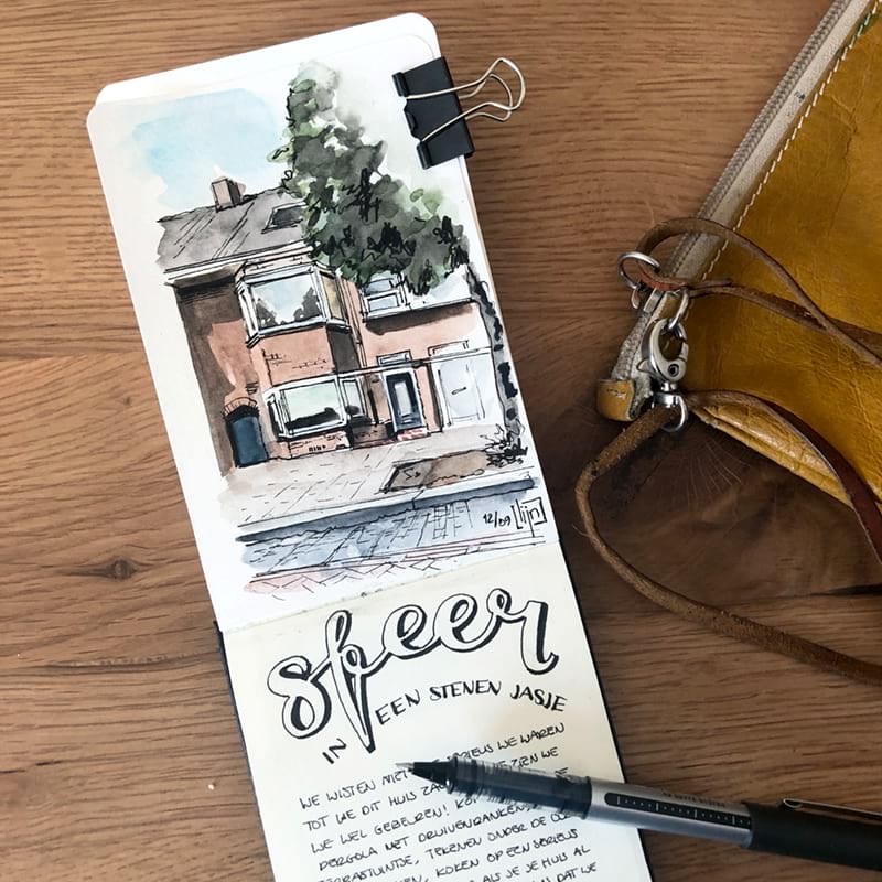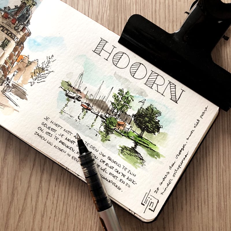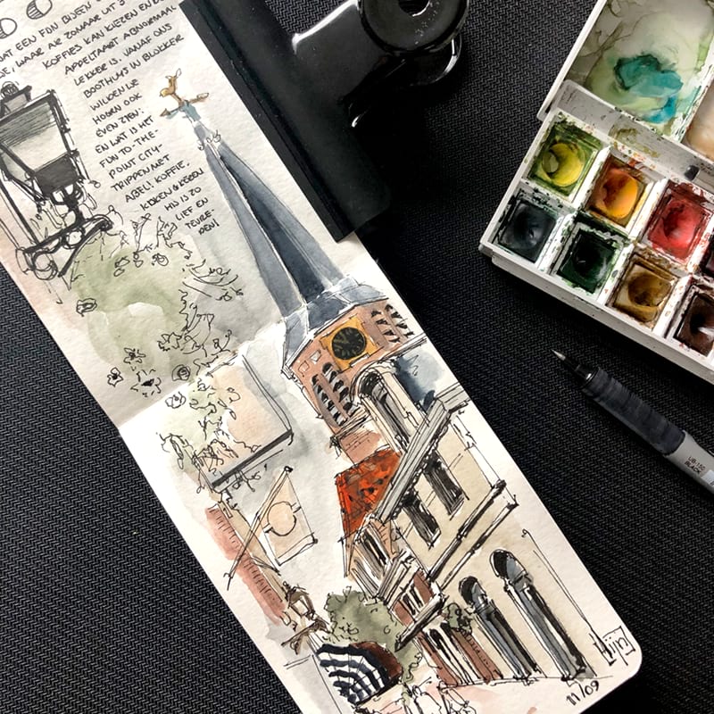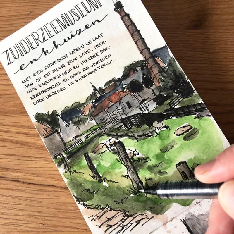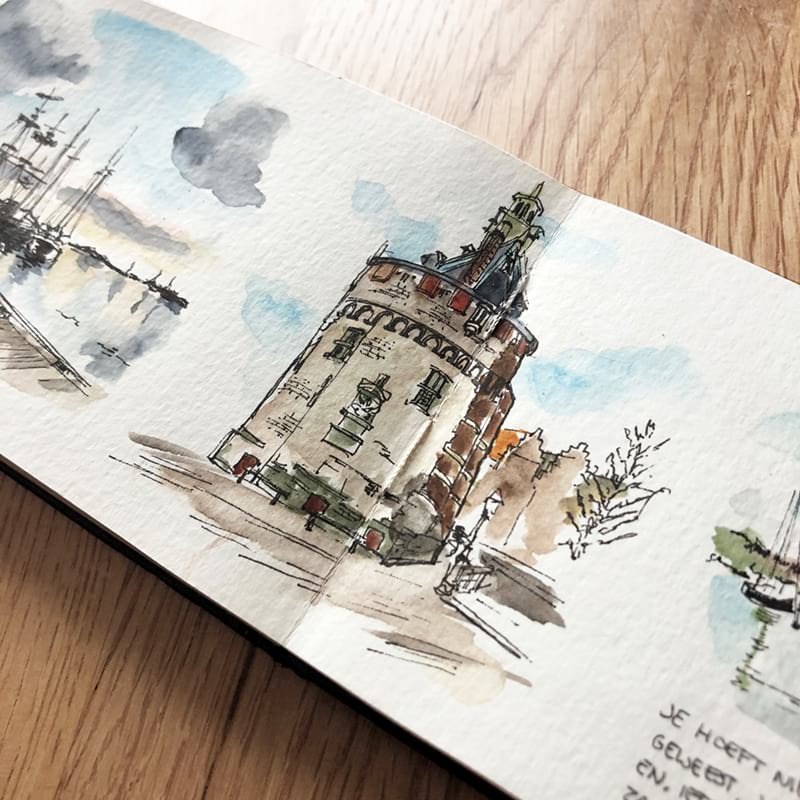 Vakantie – ook in eigen land – is altijd een zalige voedingsbodem voor mooie plaatjes tekenen. Gegarandeerd dat ik een travel sketchbook bijhoud als ik in een nieuwe omgeving ben. Een museum, terrasje, uitzicht, oude gevels en knusse straatjes, bootjes in het water: allemaal fijn om in inkt en verf op papier te hebben, dan alleen als plaatje in mijn telefoon. Dit jaar maakte ik daarom ook de workshop Travel Sketchbook online, want je trip(je) vangen in een sketchbook wil ik iedereen aanraden. Sterker nog, met het laten voorbij gaan van geweldige vakantie ervaringen door alleen snel een kiekje te schieten mis je echt alles! Teken je trip en ik beloof je zoveel meer voldoening en een zwik details die je anders nooit zag. Bekijk de workshop ook maar eens, geluk in een papieren boekje!