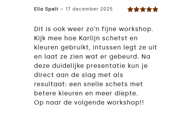 Is dit heel gemakkelijk voor de starter? Niet te makkelijk, maar wel heel haalbaar en gericht op groei. Ik doe het voor, jij doet na. Ik laat zien wanneer je te vroeg stopt, maar ook wanneer het teveel is. We bouwen op in stappen en werken ‘omgekeerd’, zodat jouw sketches geen kinderlijke kleurplaten blijven, maar eindelijk volwassen sketches met diepte worden.